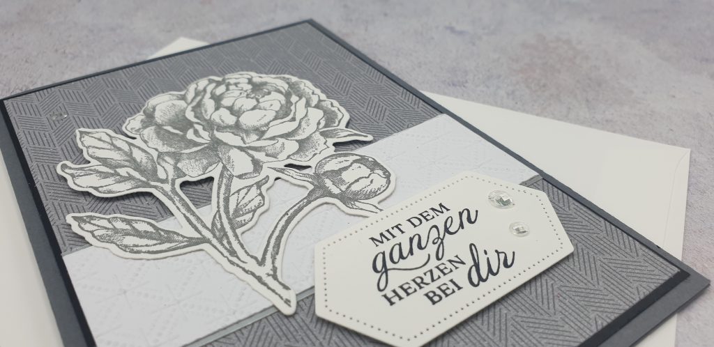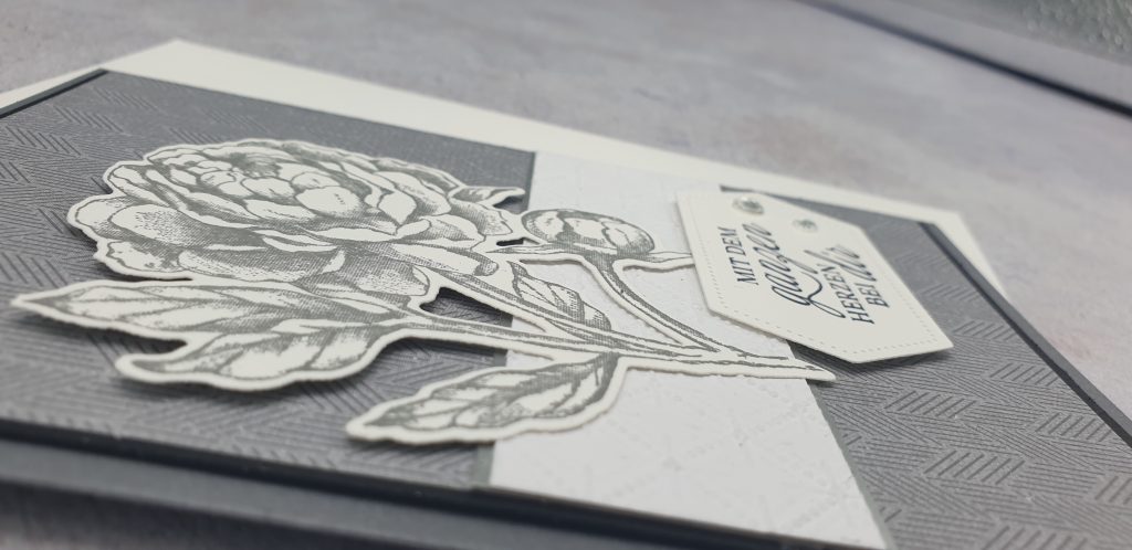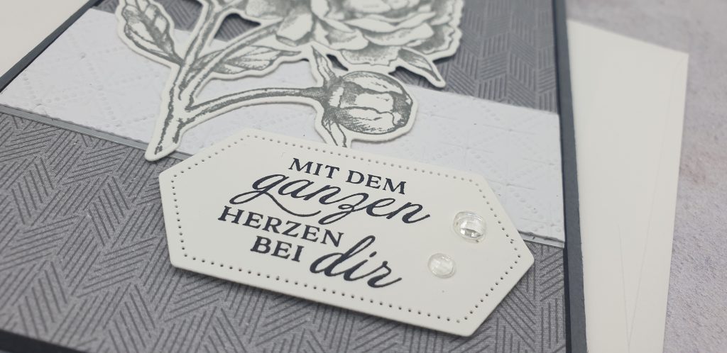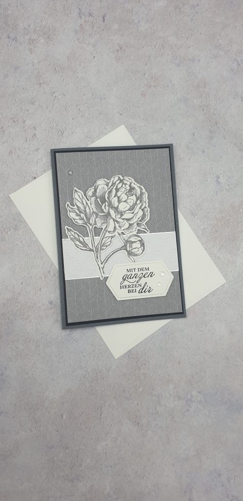 Trauerkarten basteln ist nicht ohne.Für mich müssen Beileidskarte schlich und zurückhaltend sein.Elegant und Trostspendend.Da hat es sich für mich angeboten die Karte mit dem neuen Stampin up! Stempelset “ Pfingstrosenpracht“(Poduktpaket 154060) zumachen .Desingerpapier „Pfingstrosenpoesie“(152483), Facettierte Glitzersteine (152464)